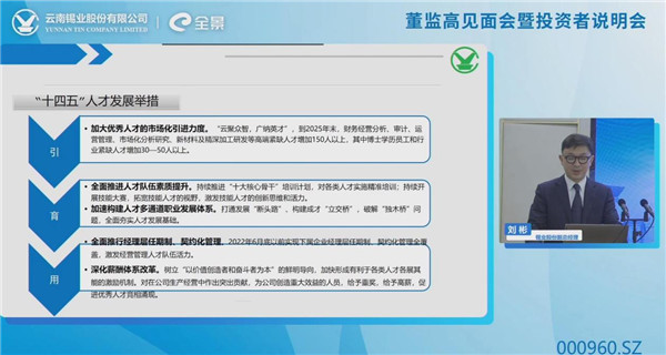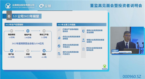 董事長(zhǎng)、總經(jīng)理劉路坷介紹了公司資源、業(yè)務(wù)產(chǎn)業(yè)鏈、產(chǎn)品及近期生產(chǎn)經(jīng)營(yíng)情況,同時(shí)充分闡述了公司未來發(fā)展戰(zhàn)略,即圍繞著打造全球錫、銦全產(chǎn)業(yè)鏈供應(yīng)鏈“鏈主”的發(fā)展愿景,以“綠色智能補(bǔ)鏈、精深加工延鏈、改革創(chuàng)新強(qiáng)鏈”為發(fā)展理念,圍繞資源拓展、現(xiàn)代礦山、原材料制造、新材料和精深加工、供應(yīng)鏈五個(gè)業(yè)務(wù)單元布局有色金屬全產(chǎn)業(yè)鏈,助推上市公司高質(zhì)量發(fā)展。